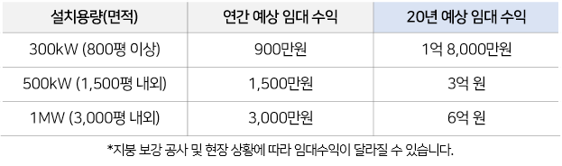 티에너지가 직접 임대하여, 20년 장기 임대 계약을 맺으며, 임대료는 설치용량 1kW당 연간 3만원을 지급합니다.